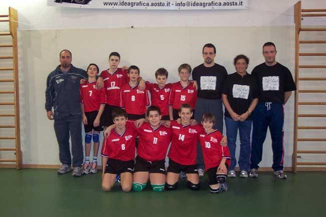 | Ecco la penultima nidiata della pallavolo maschile ad Aosta; come i loro fratelli maggiori di quasi dieci anni prima, anch'essi hanno affrontato il campionato con Torino, pagando a suon di sconfitte la loro inesperienza; due punticini, comunque, li hanno racimolati, e quanto valgano lo si è visto poi nel campionato valdostano, quando hanno affrontato con ben altra sicurezza i pari età di Morgex, ricavando dalla vittoria il titolo di "Campioni Regionali 2003-2004". Ci sarebbero poi state le finali nazionali in Veneto, ma il periodo scelto (un'intera settimana a fine scuola) e una certa confusione nelle informazioni (che il soggiorno era pagato lo abbiamo saputo quando già avevamo deciso di non andare) hanno impedito la nostra partecipazione. |